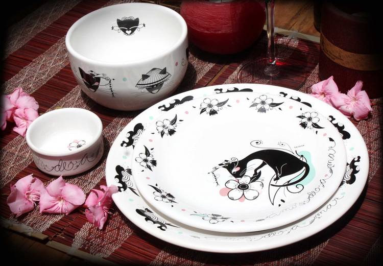 La reformulación material también llega a la cerámica tradicional, de la mano de Amazónica, el emprendimiento que convoca a ilustradoras reconocidas para crear colecciones temáticas de vajilla. Car Pintos, Ana Sanfelippo, Katana y Clau Loncar, entre otras, responden a diversas consignas que luego se mprimen en calcos vitrificables. «El recorte, uno por uno, requiere un trabajo específico de aplicación sobre cada pieza de cerámica en blanco. Luego se hornean, y la magia de la química permite que la belleza salga a la luz», dice Sol Silva, al frente de Amazónica.